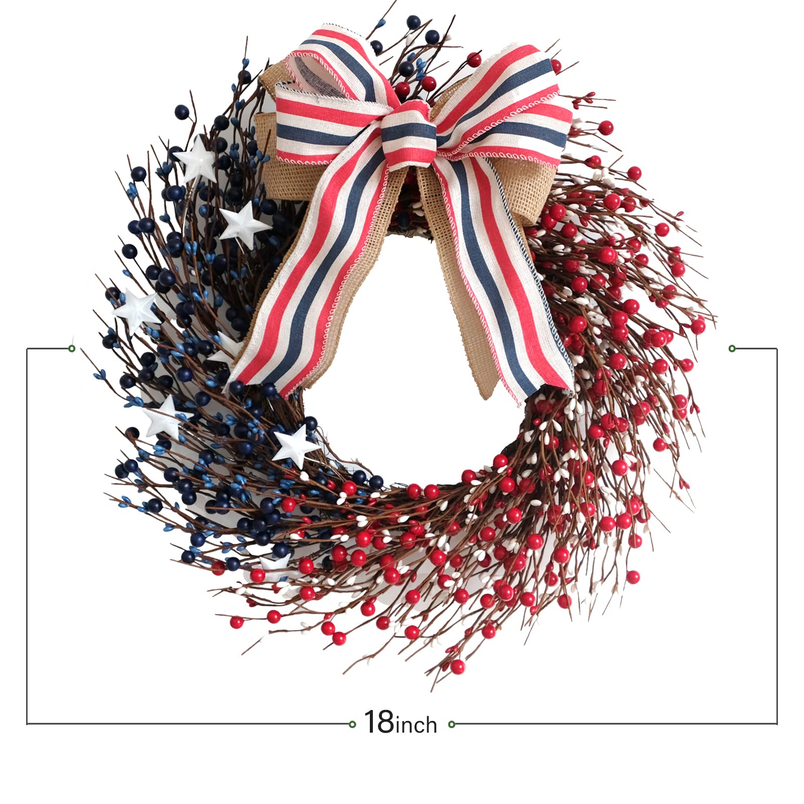 - 【18 Inch Independence Day Home Decoration】The outer diameter of this Independence Day wreath measures 18 Inch, 18 Inch size has a wide decorating use, you can hang it on your front door, porch doors, indoors and outdoors, wall, windows, shopping windows, fireplace, living room and bed rooms.
