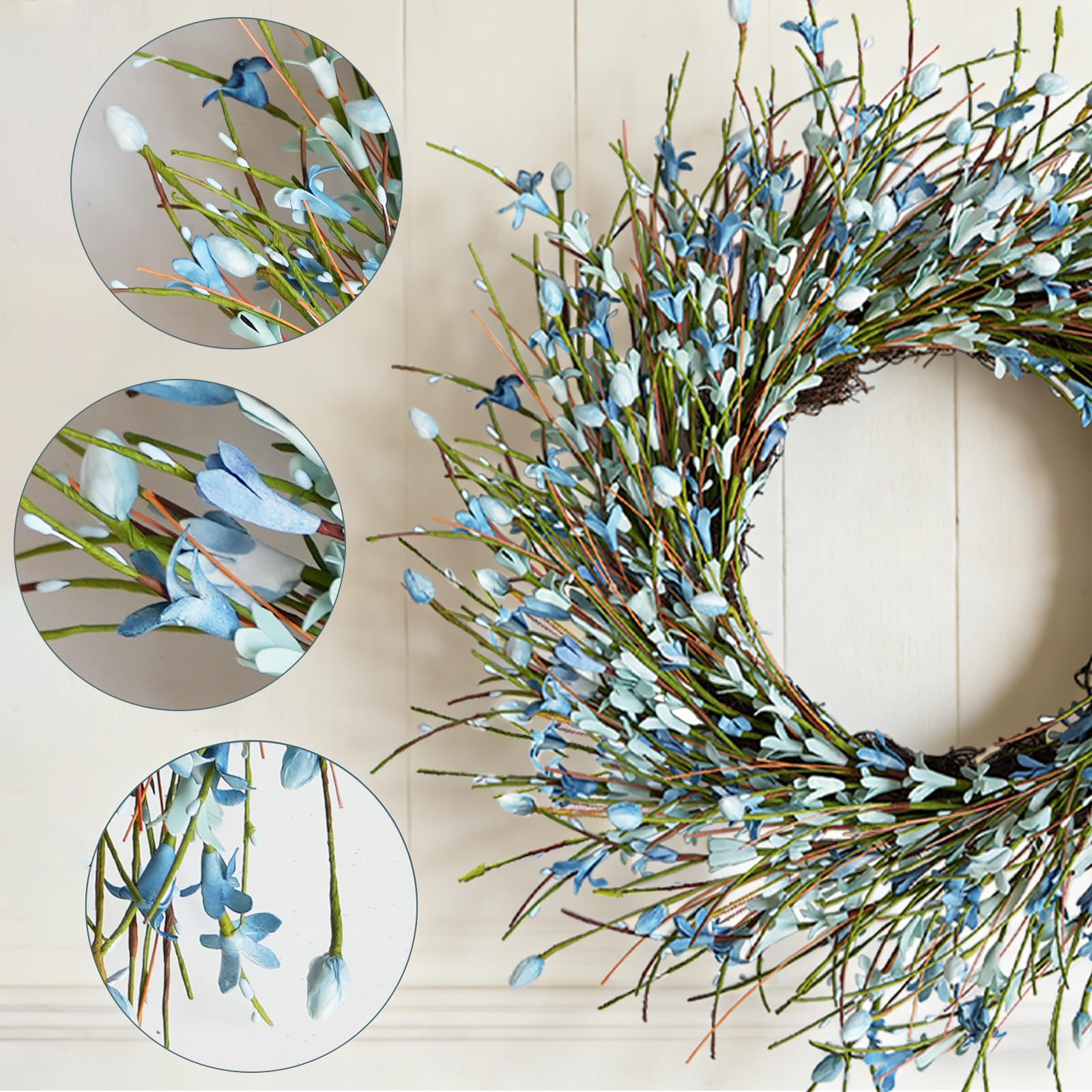 Bibelot 20inch Artificial Forsythia Flower Wreath, All Year Around Wreath for Front Door, Wedding Window Home Wall Indoor Front Door Decor (Blue, 20in)