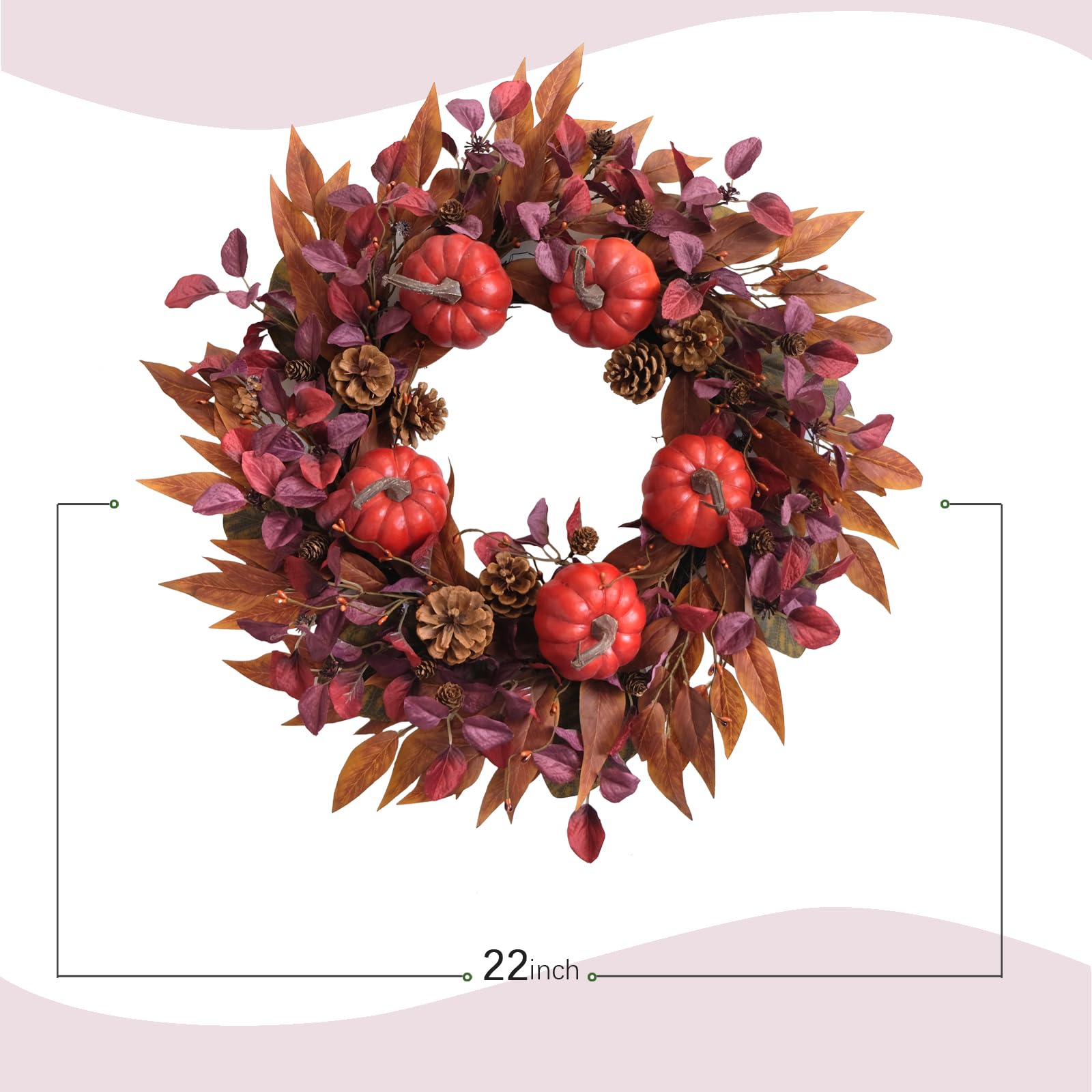 - 【 Versatile Hanging Decor for Every Space】Perfect as front door wreath, porch decor, indoor wall accent, or farmhouse mantel display. Its 22-inch size fits standard doors, while the warm harvest tones (burnt orange, wine red) create a welcome focal point for Thanksgiving, Halloween, or fall season.
