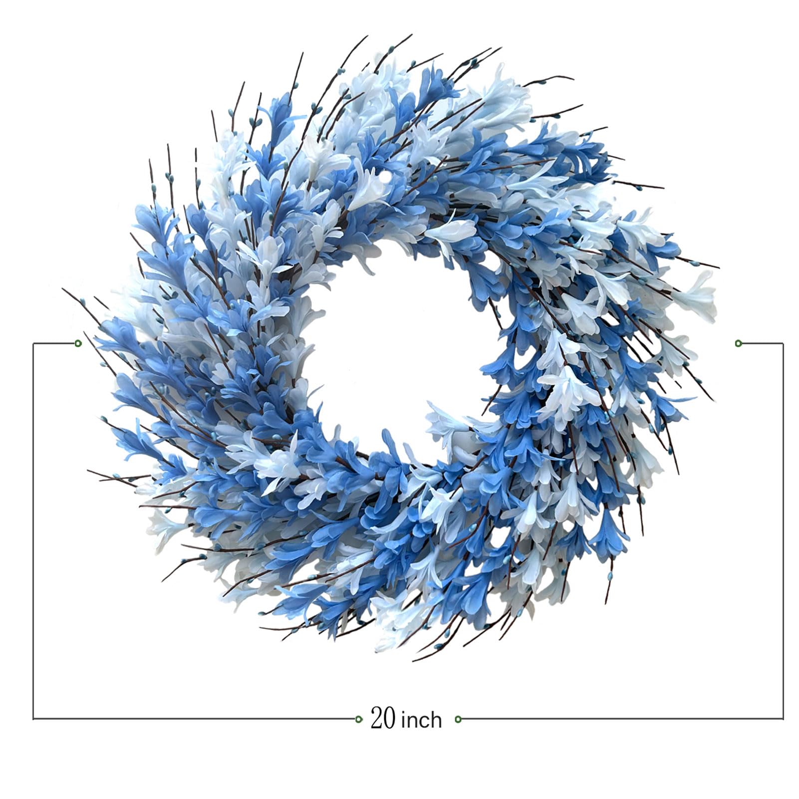 Bibelot 22inch Artificial Forsythia Flower Wreath Spring Summer Fall Wreath Silk Leaves for Front Door Porch Farmhouse Patio Garden Home Decor (Blue)