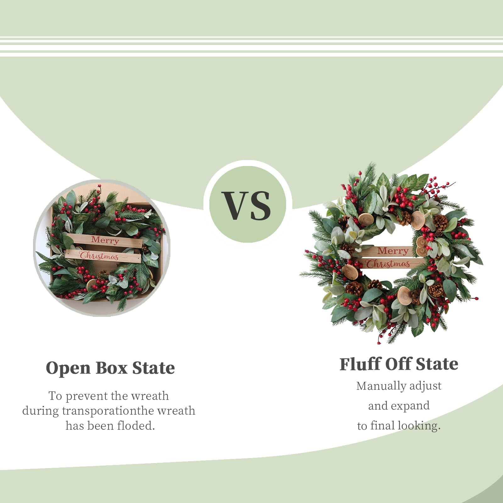 - Medium Size: The wreath has a diameter of 24 inches when fully expanded. It's neither too big nor too small for your front door decoration. Due to the wreath needing to be compressed into a relatively small box for shipping requirements, you will need to expand the branches and adjust the leaves and berries to their optimal shape to achieve a complete 24inch wreath.