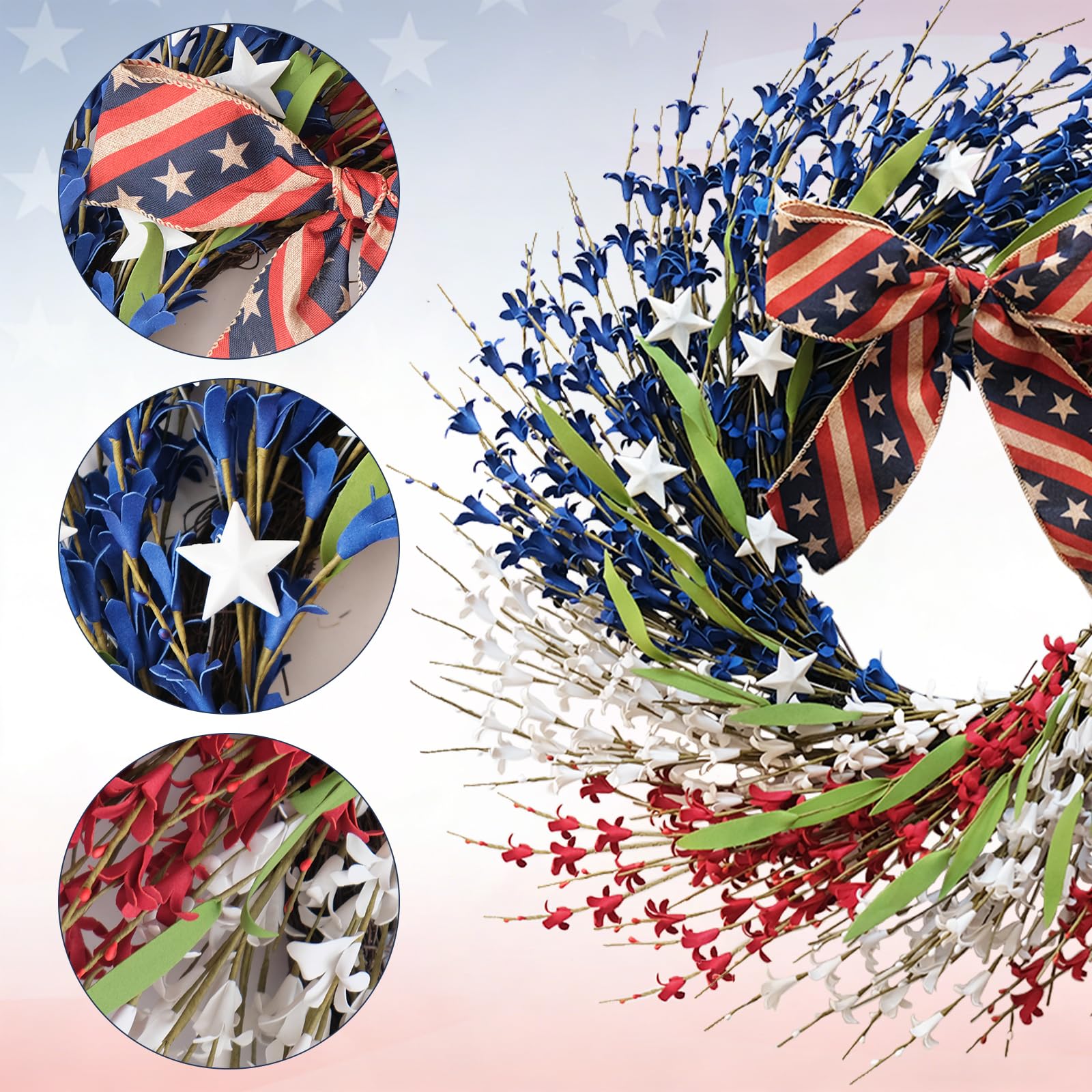 - 【Classic Americana Style】This patriotic wreath features a stunning blend of red, white, and blue forsythia flowers, accented with crisp white stars and lush greenery. It's designed to make your home's entrance stand out with dignified, festive charm for any national holiday celebration