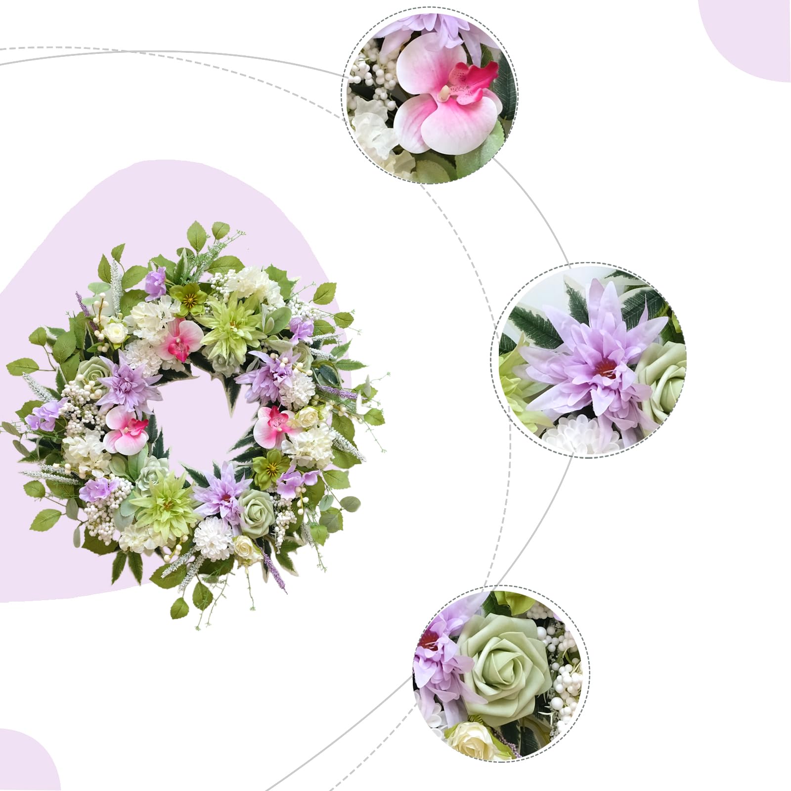 - 【Captivating Spring Welcome】Invite the beauty of the season to your doorstep with this exquisite spring door wreath. Featuring a lush mix of purple dahlias, white hydrangeas, and pink orchids, its vibrant, handcrafted design instantly brightens your entryway