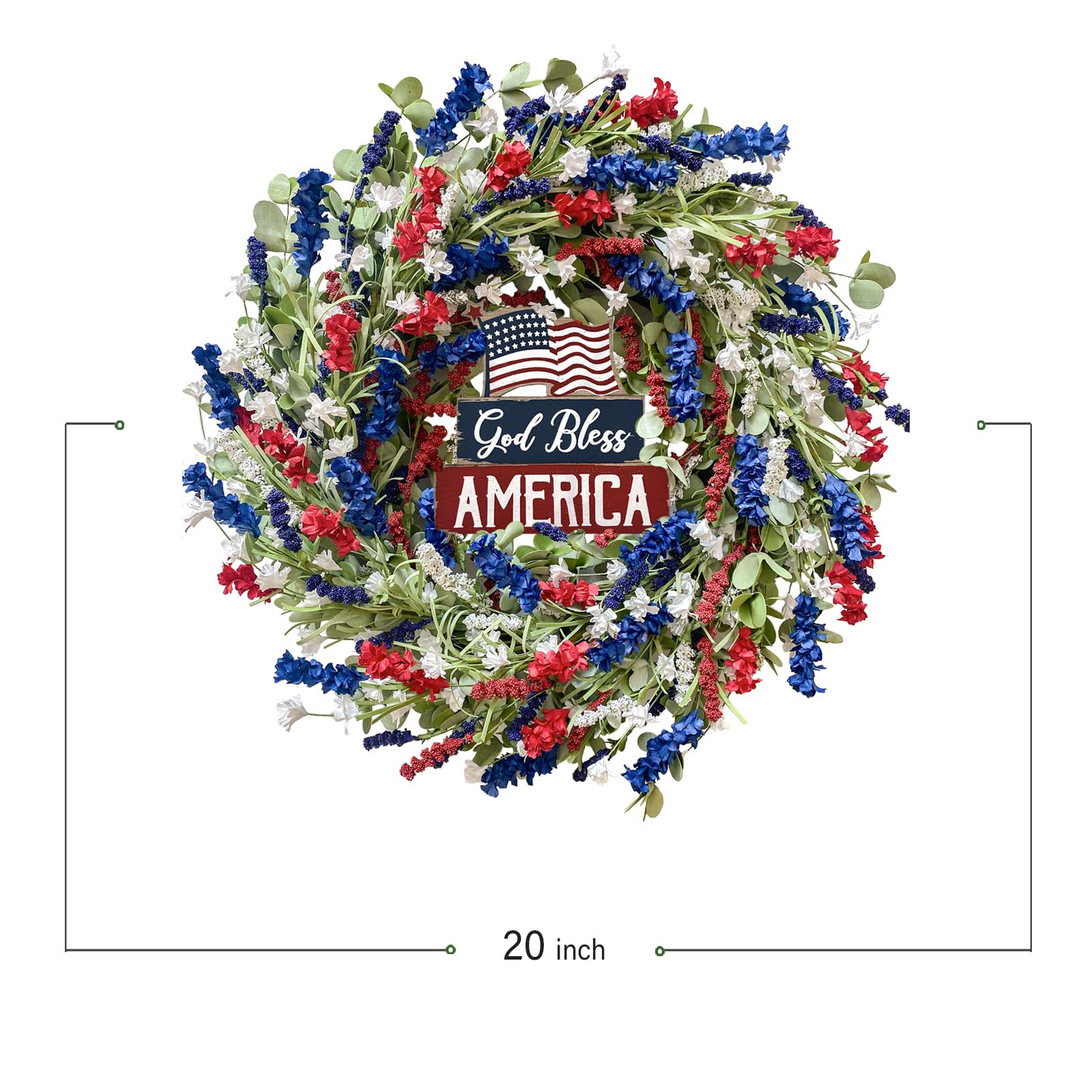Bibelot 4th of July Independence Day Red White Blue Flower Wreaths, 20" Artificial Flower Wreath with God Bless America Sign Decoration for Front Door, Memorial Day Wreath for Wall Window Party Decor