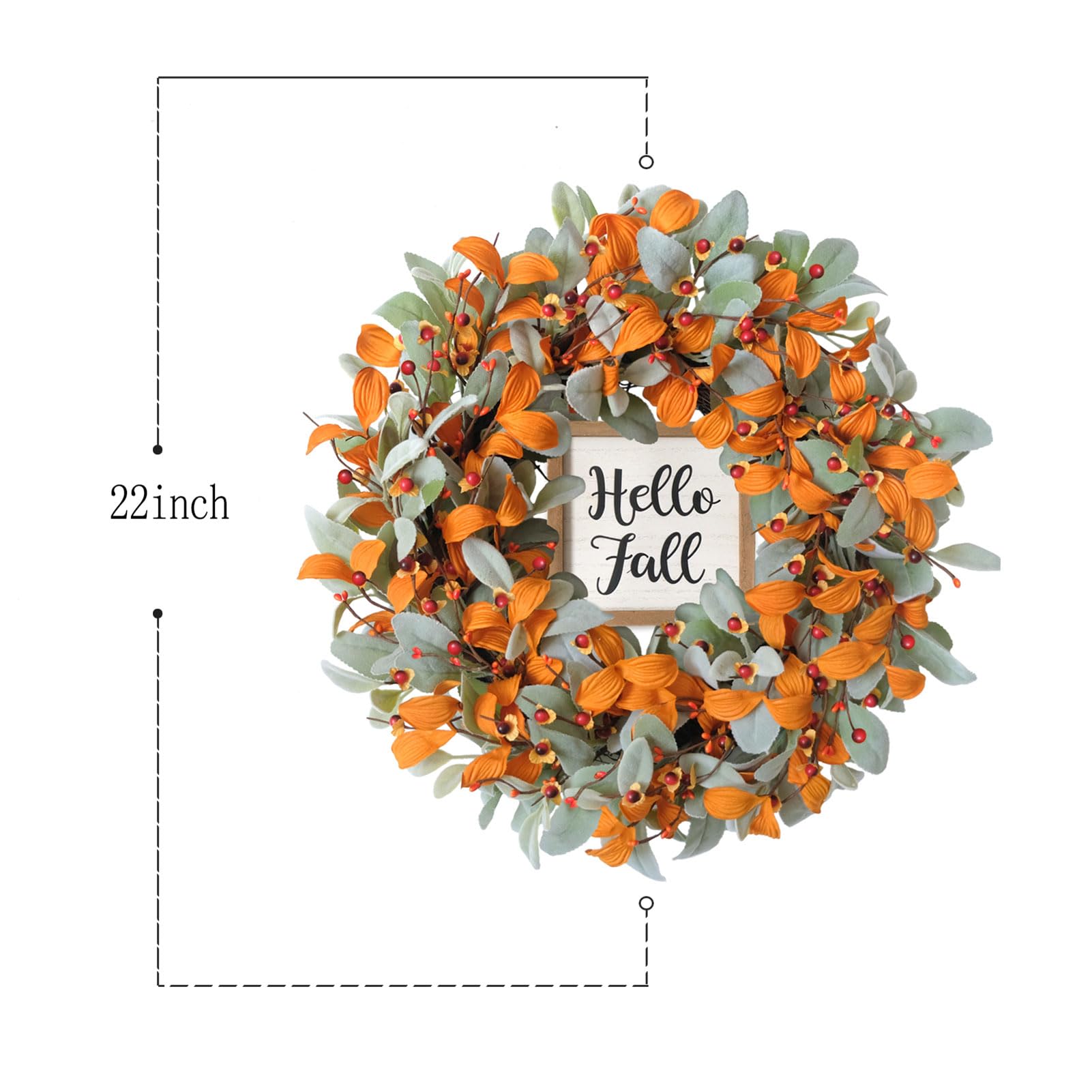 Bibelot Fall Wreaths for Front Door, 22'' Lambs Ears Leaves Berries Wreath with Hello Fall Sign Artificial Wreath for Halloween Front Door Window Home Wall Farmhouse Holiday Outdoor Indoor Decor