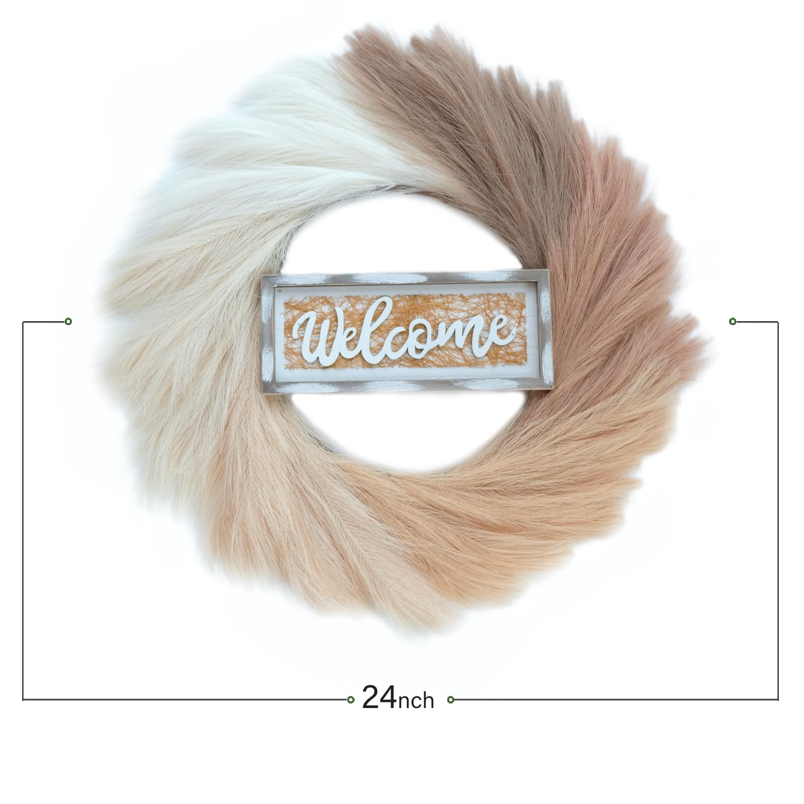 Bibelot Pampas Grass Wreath, 24’’ Artificial Pampas Wreath with Hello Sign, Pampas Farmhouse Wreath for Front Door Decor