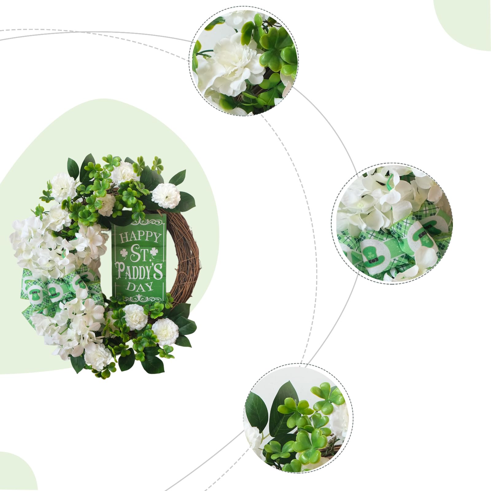 - 【Lucky Shamrock Design】This charming St Patricks Day wreath features a natural grapevine base adorned with vibrant shamrocks, white flowers, and a festive green bow. The "Happy Paddy's Day" wooden sign adds a cheerful touch, bringing Irish luck and holiday spirit right to your door